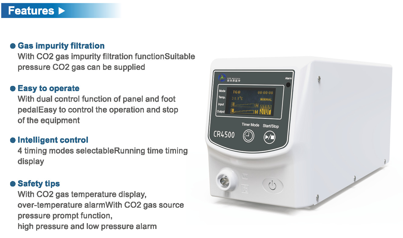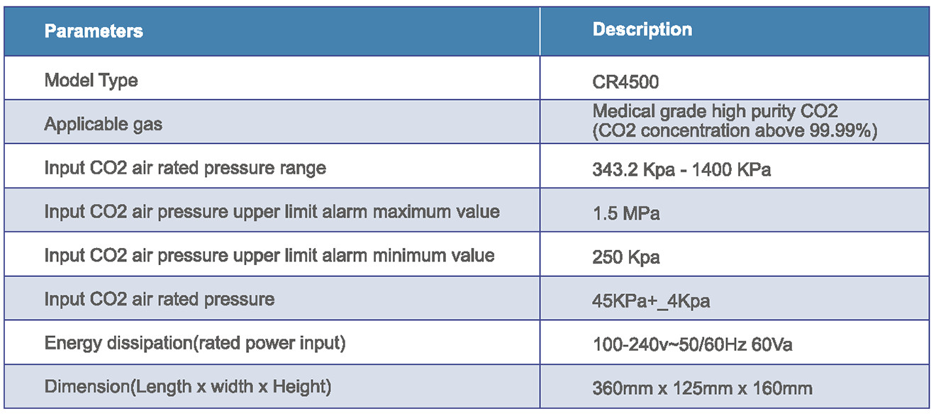 Indication:The endoscopic C02 regulation unit is used for injection of carbon dioxide and water, and gas supply is only limited to upper and lower gastrointestinal tract.