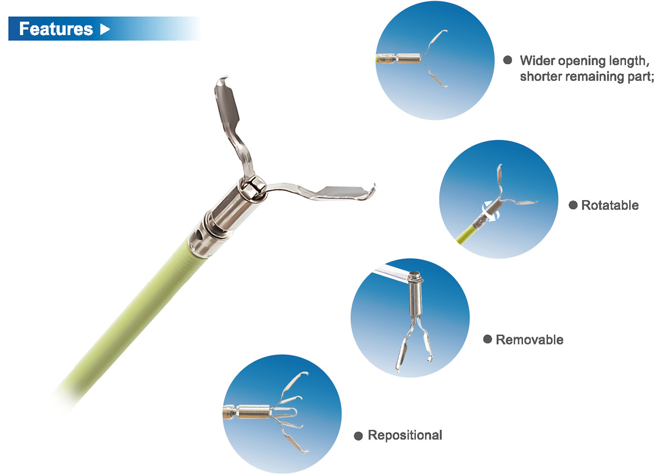 Indication:The device is compatible with endoscope, which is indicated for clip placement within digestive tract for the purpose of mechanical pressure treatment of bleeding of small arteries and pulsation. The device is intended for single use.