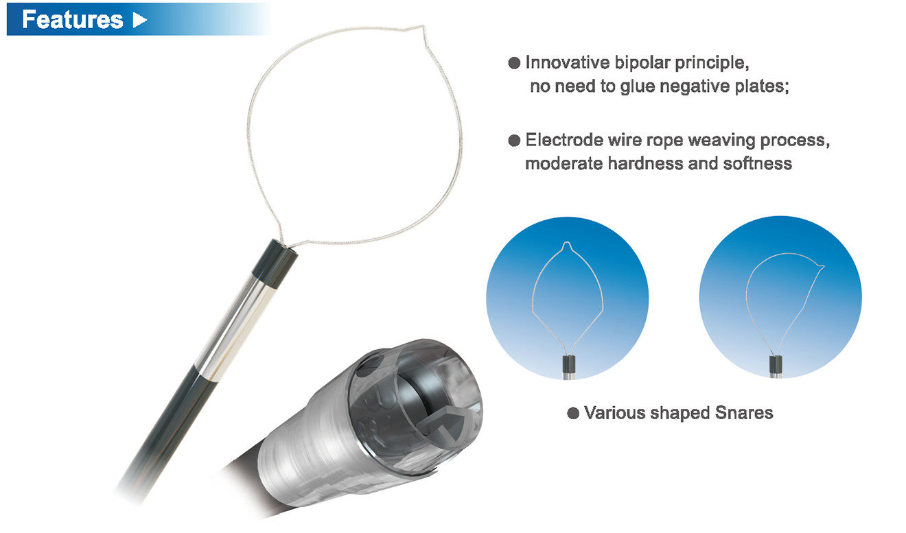 Indication:Bipolar Polypectomy Snare Combination has been designed to be used withendoscope and electrosurgical unit for the removal of sessile polyps, pedunculated polyps, tissue andforeign bodies from within the GI tract using high-frequency current.
